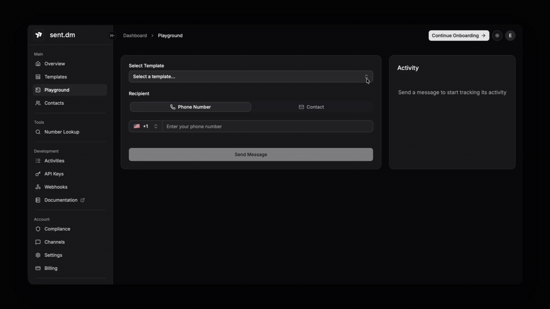 Open the Dashboard Playground. Pick one of the pre-built templates, enter a phone number, and send a real message — all from your browser.